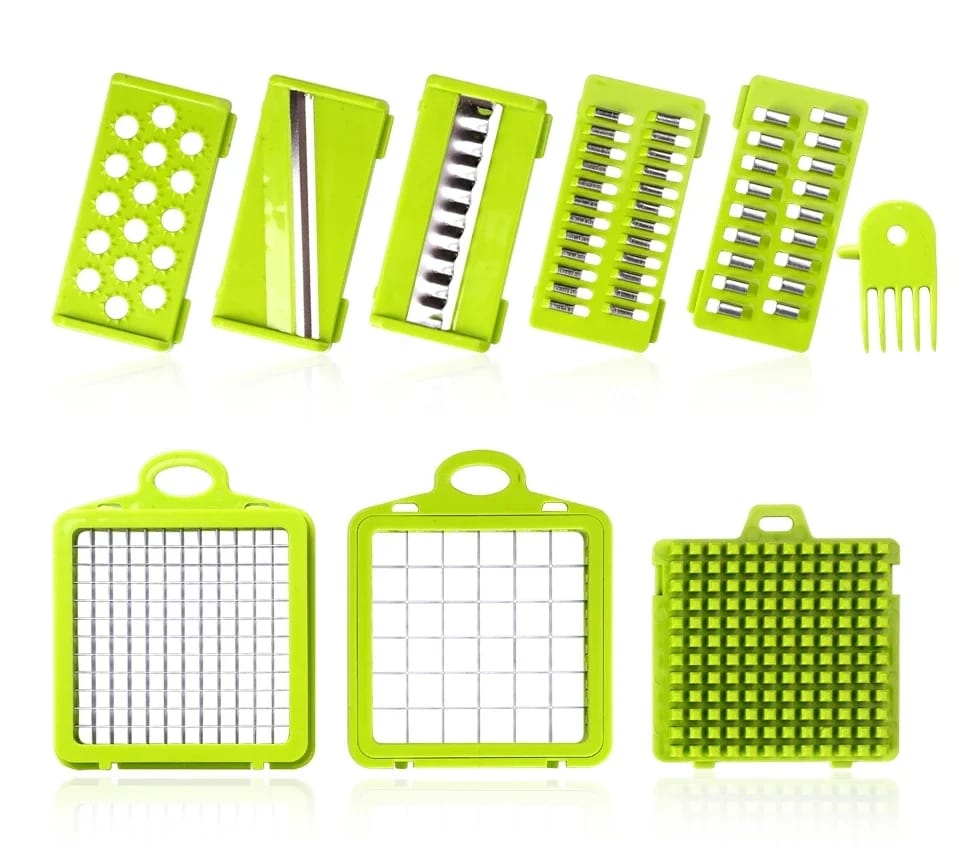 CORTADOR PICADOR DE VERDURAS FRUTAS MULTIFUNCIONAL 1 SET 14 EN 1 Este cortador de verduras y frutas está hecho de material plástico ABS de alta calidad sin BPA, lo que lo hace duradero y resistente. Las cuchillas de acero inoxidable endurecido de grado 420 ultra afiladas son ideales para picar y cortar verduras duras. El producto cuenta con 8 cuchillas intercambiables, que ofrecen diversas maneras de cortar, triturar y rallar. Los alimentos pueden ser cortados en diferentes grosores de seda y rodajas. Incluye un separador de claras de huevo para separar fácilmente las claras de las yemas. Es importante recordar no poner las cuchillas al azar. Después de enjuagar y secar, se deben recoger en el recipiente y mantener alejadas de los niños. El producto es fácil de desmontar alrededor de las cuchillas para una limpieza profunda y cómoda. Este cortador multifuncional de verduras puede ayudar a acortar el tiempo de preparación en comparación con las cuchillas tradicionales para picar y cortar tomates, pimientos, zanahorias, remolachas, pepino, cebollas, ajo. ESPECIFICACIONES: * Color: Negro con Verde* Medidas: 11cm*11cm*32cm* Materiales: Plástico +Acero Inoxidable PAQUETE INCLUYE: * 2 Cuchillas para picar* 1 Rallador de queso grueso* 1 Rebanador ondulado* 1 Rallador de queso para pastas* 1 Rallador fino para ajo* 1 Slicers* 1 Pelador* 1 Protector de manos* Separador de huevos* 1 Envase de almacenamiento